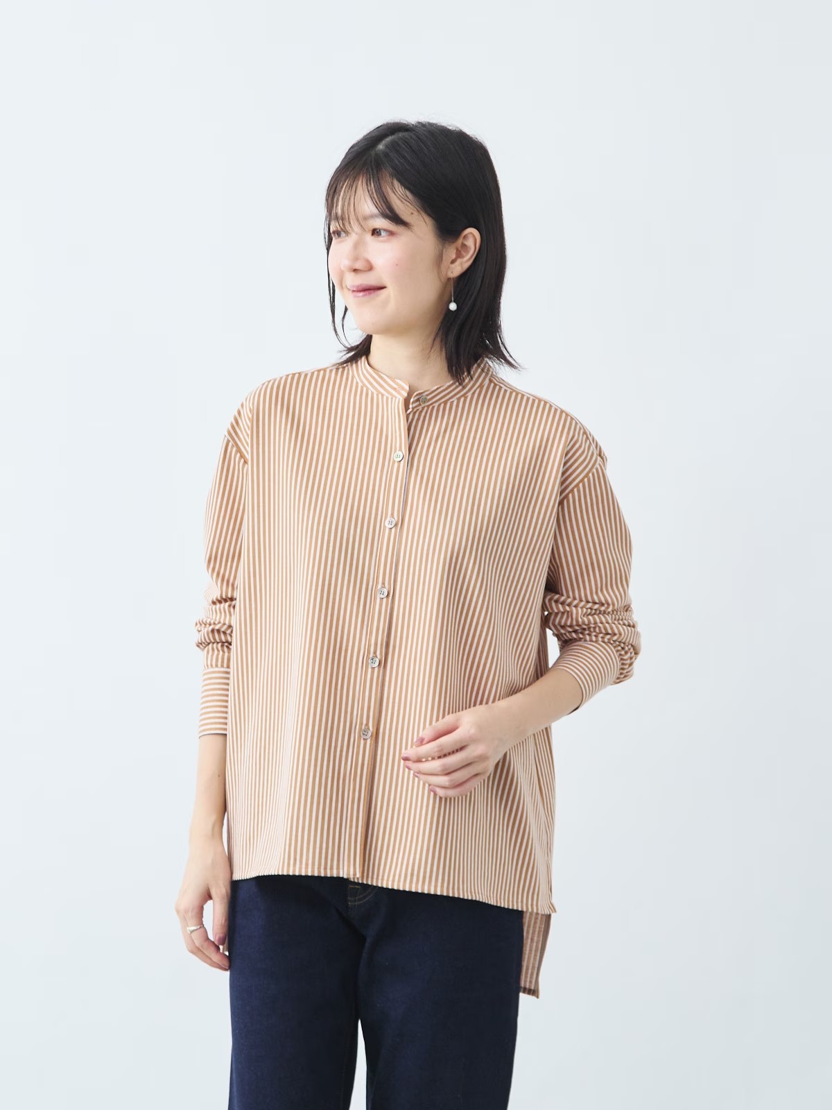 巷にはストライプの柄がスリットの端にチラチラはみ出ていたり…というものも多くありますが、このブラウスはスリット部分まで柄が均一に出るように調整されているんです。(地の目に合わせているため、ストライプの中間にスリットが入ることはあります)